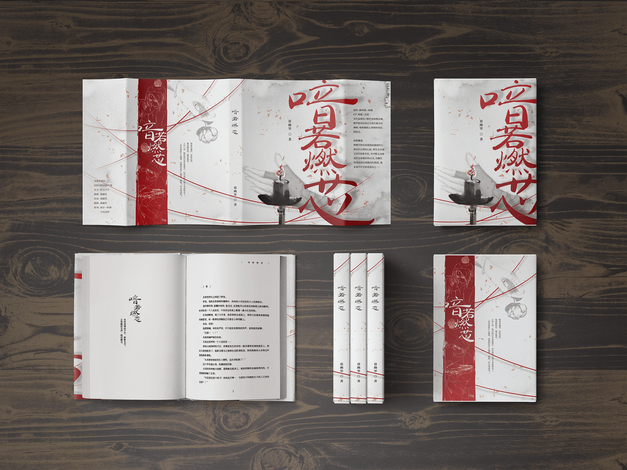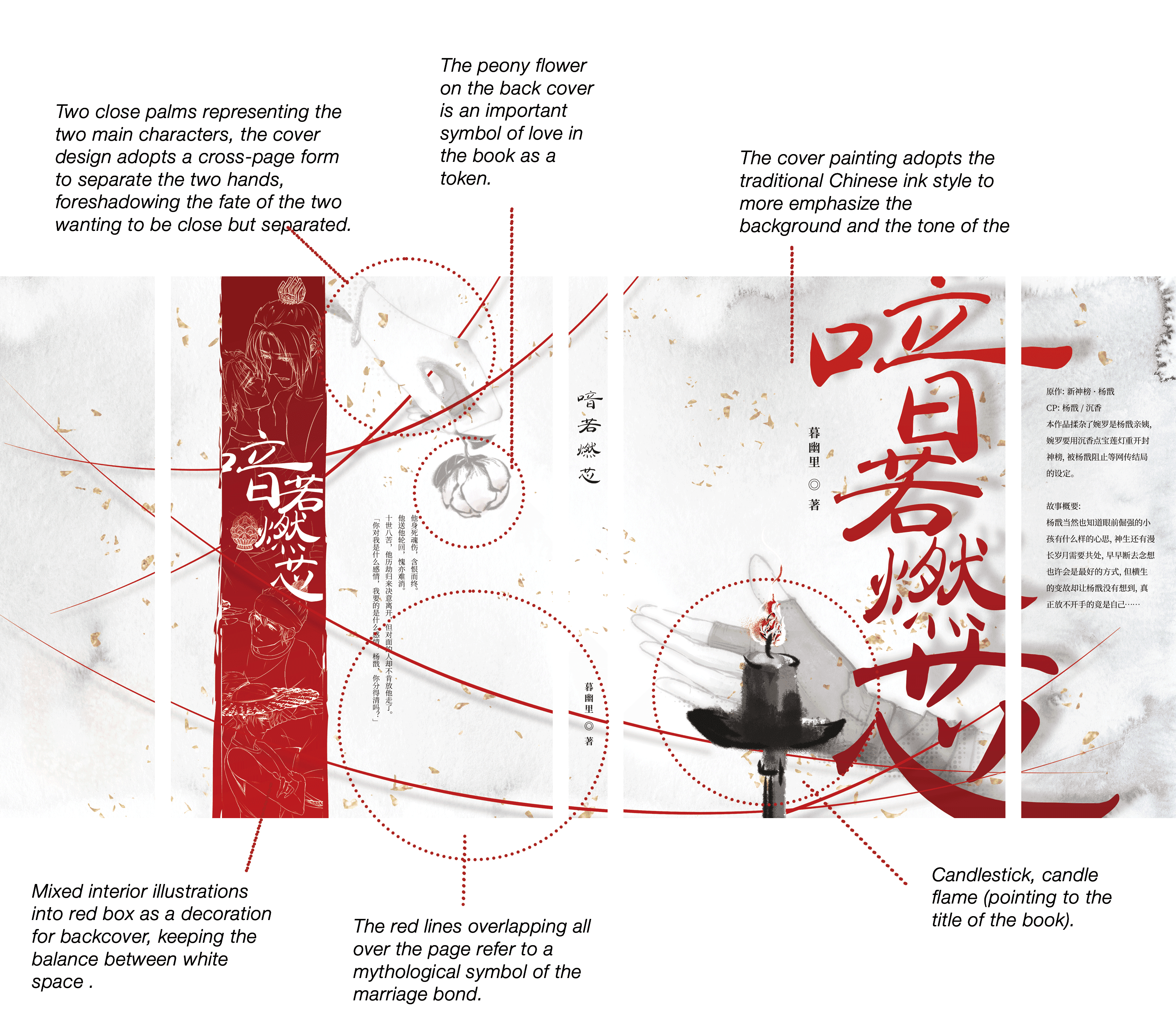 Client requested to use an Chinese vintage style in the cover design, echo the story title (eg, burning candle), and add some key elements that appeared in the story. I chose the peony flower and red lines which both represent love/affection.