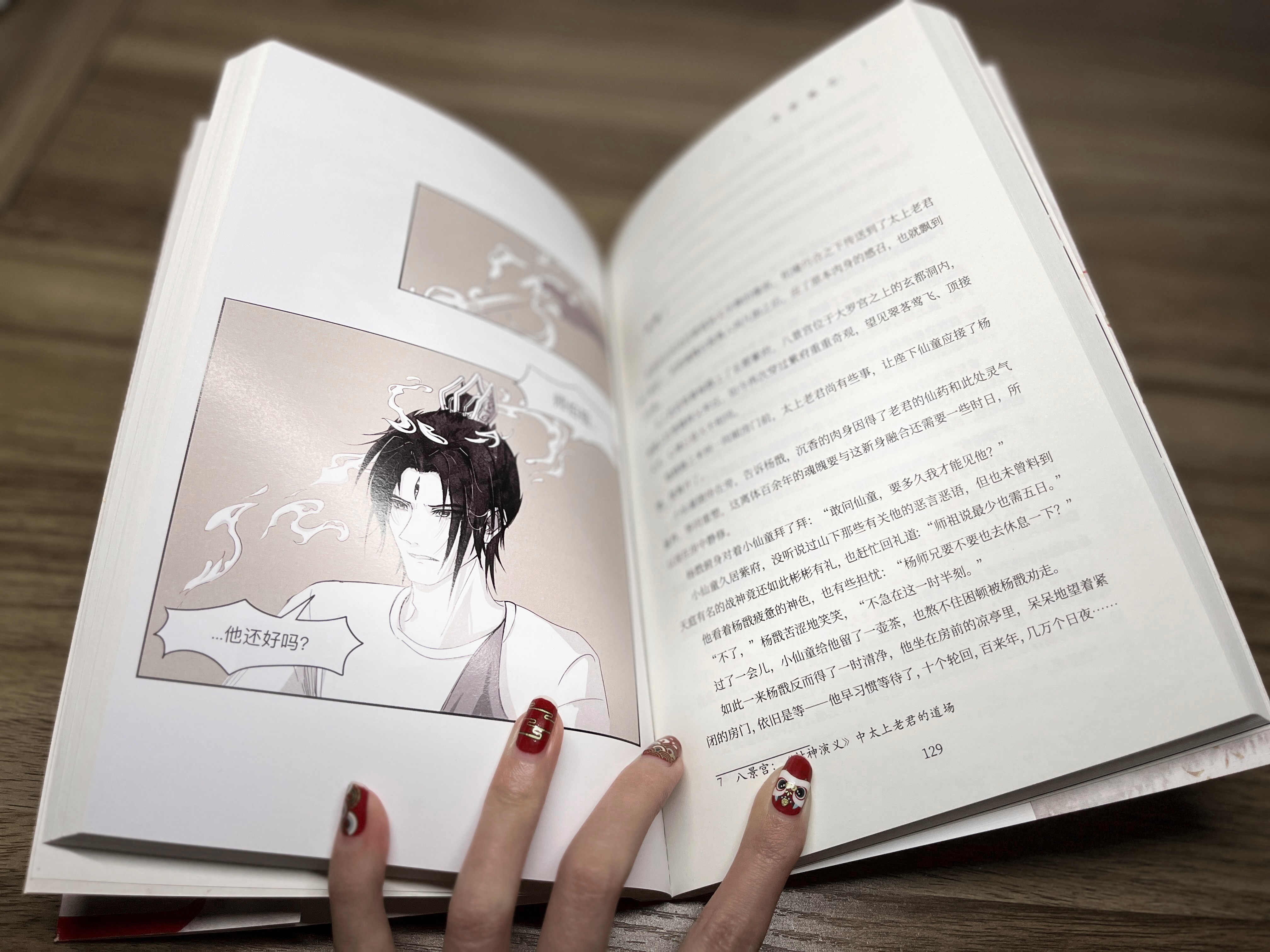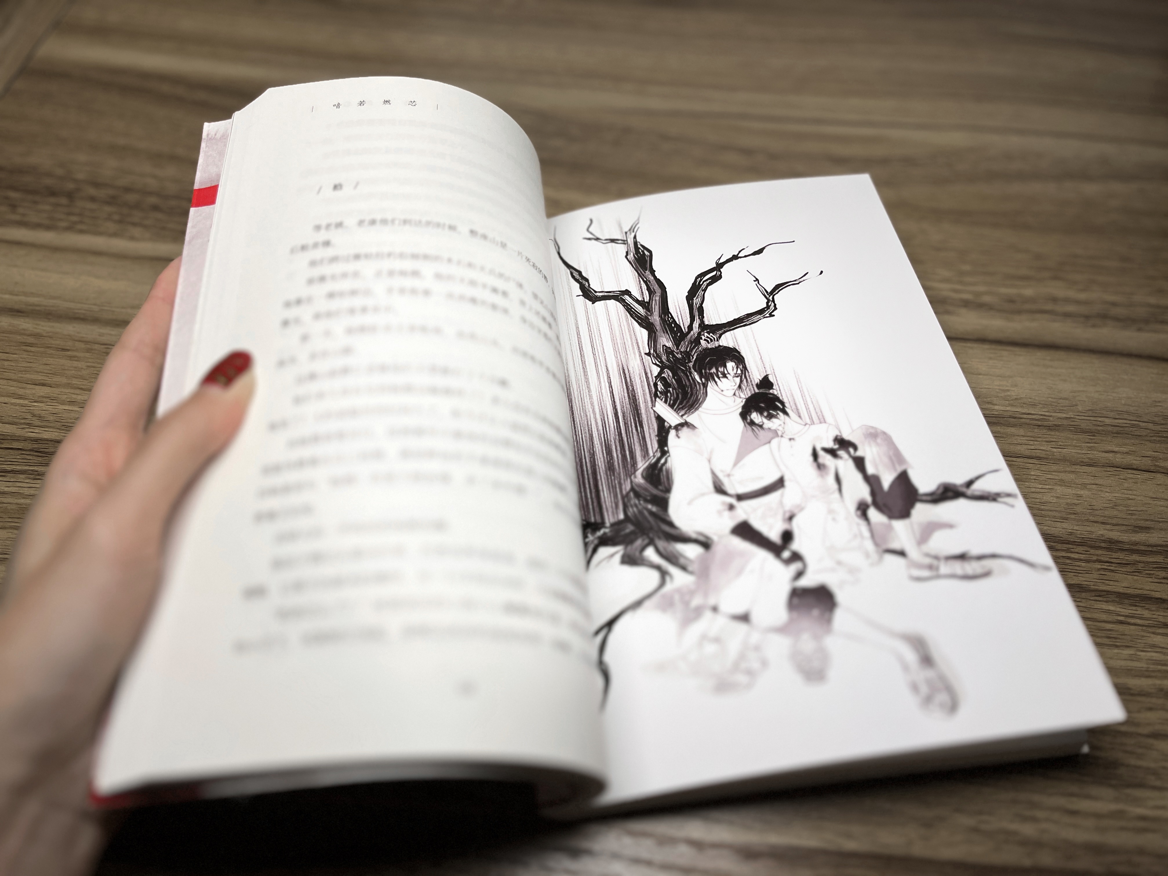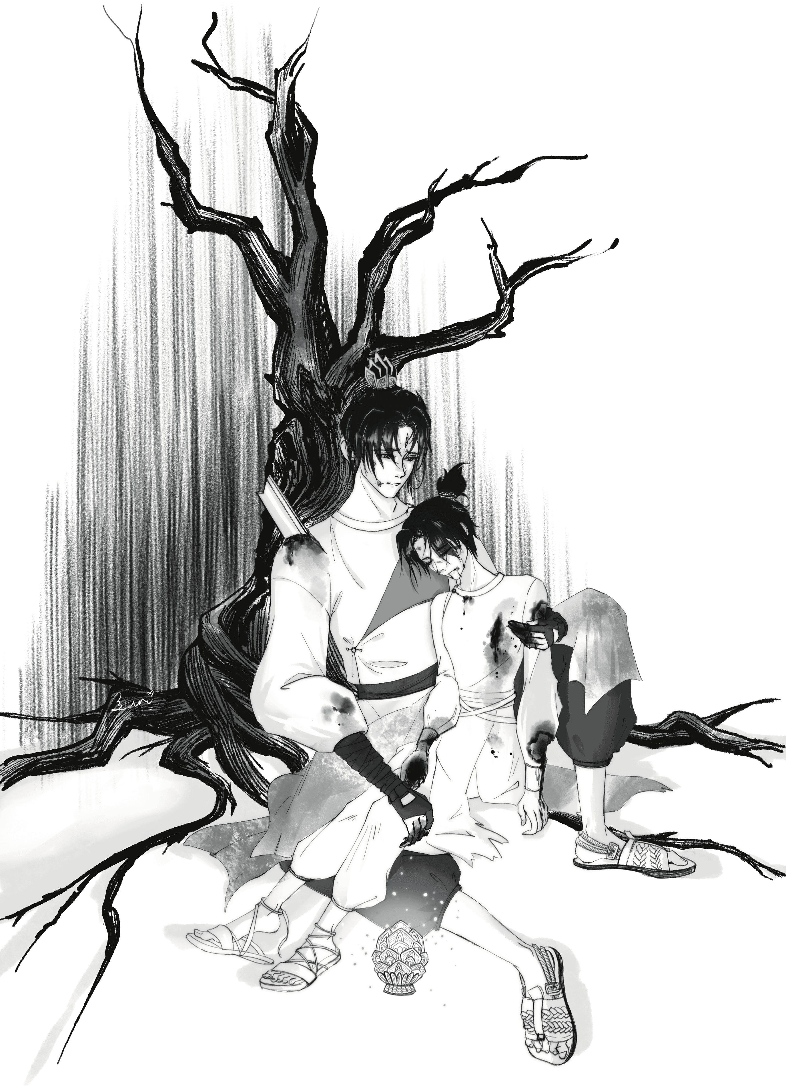 That shimmering light was none other than Yang Jian, whose heavenly eyes were half-closed and a sharp blade was still stuck in his back. He was leaning against a withered tree, holding a thin body in his hands. The Baolian Lamp around him was emitting a gentle shimmering light, enveloping them.